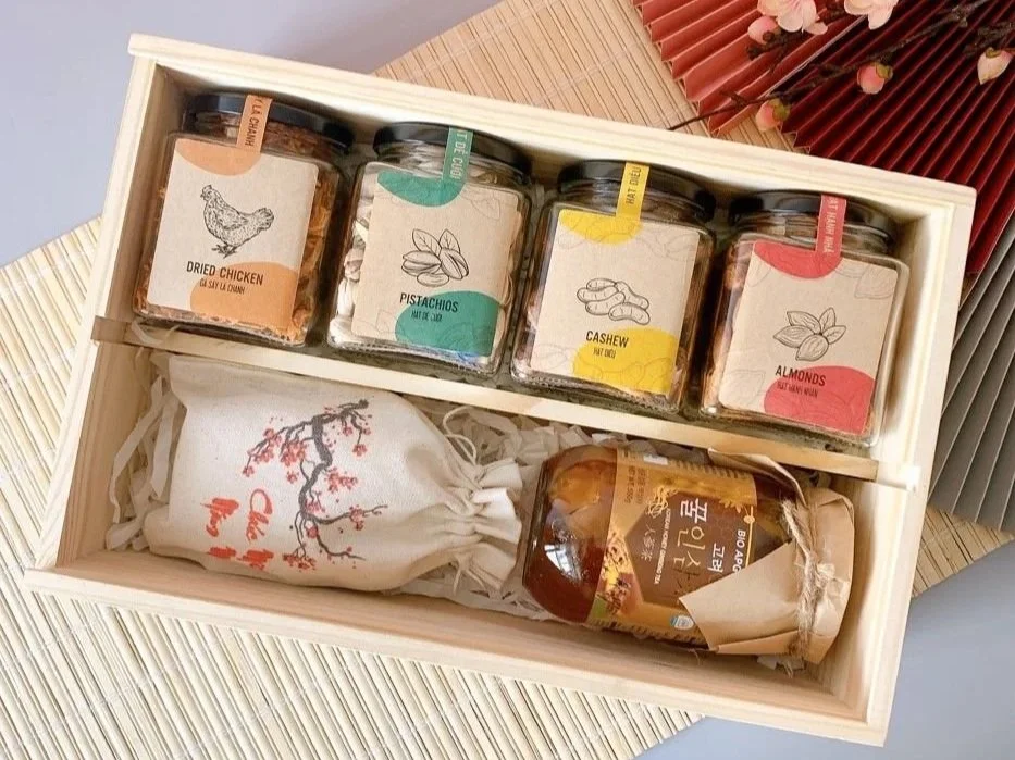 Positioned as a healthy and corporate-friendly option, Ans Gift focuses on well-balanced Tết gift boxes designed for partners, clients, and employees. The Ans 20 Tết Gift Box is presented in a sturdy wooden box and features a curated selection of nutritious imported items, including Korean ginseng honey, American pistachios and butter almonds, Chilean raisins, dried grapefruit peel, and Snow Flower peach blossom tea, offering a thoughtful alternative to sugar-heavy festive hampers.