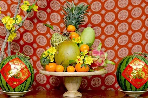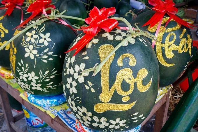 However, the five fruits differ depending on where you are - North, South or Central Vietnam. Often, two watermelons (some even have Tết sayings and symbols painted on them) are displayed at the altar because of their lucky red colour, which is used to symbolize prosperity and good fortune.